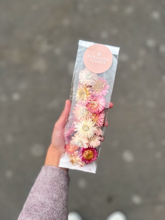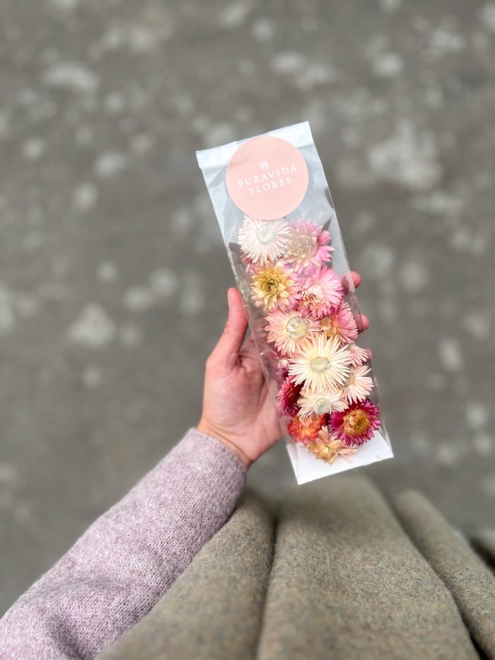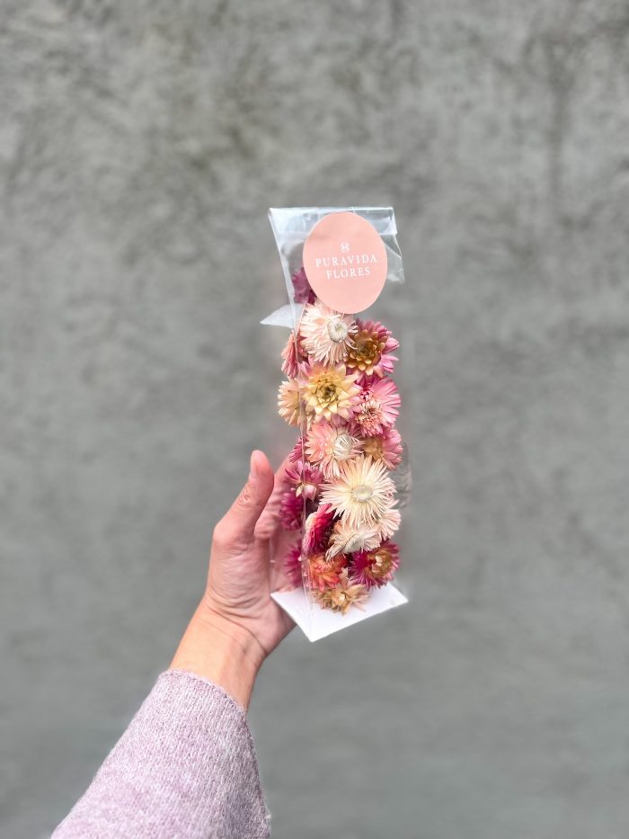 Incluye 10 gramos de cabezas de Helicrisos secos en distintos tonos del color Rosado, ideales para ser usados en manualidades, decoración, entre otros.