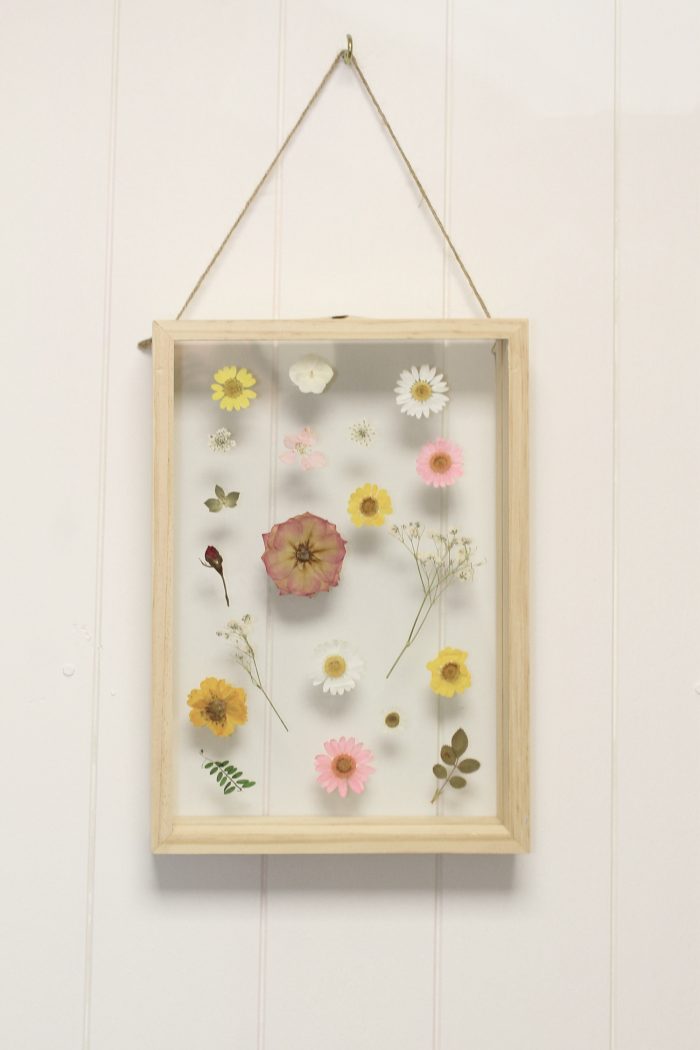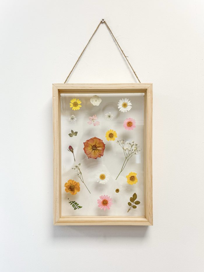 Cuadro de flores prensadas naturales entre vidrios en tonos amarillos, rosados, blancos y verdes. Incluye marco de madera. Ideal para decorar tu casa.