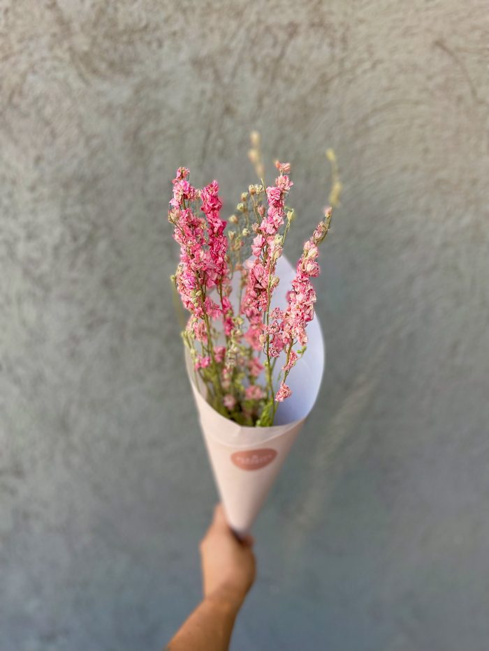 Incluye un ramo de Delphinium Rosado seco. Largo aproximado 50 cms.