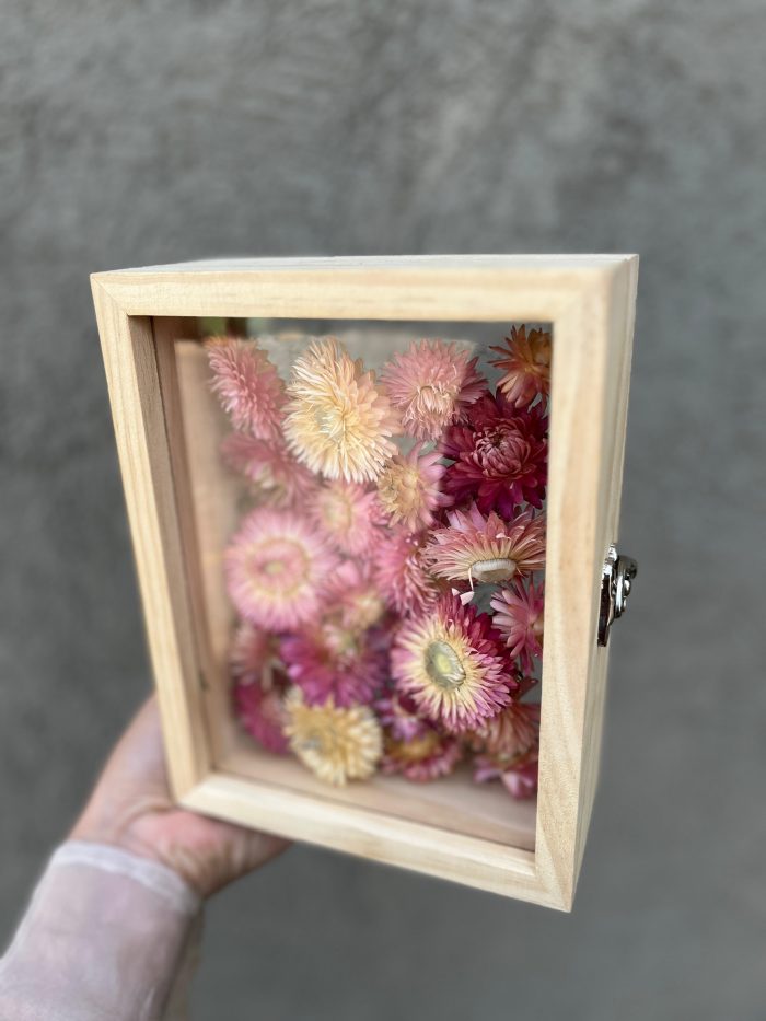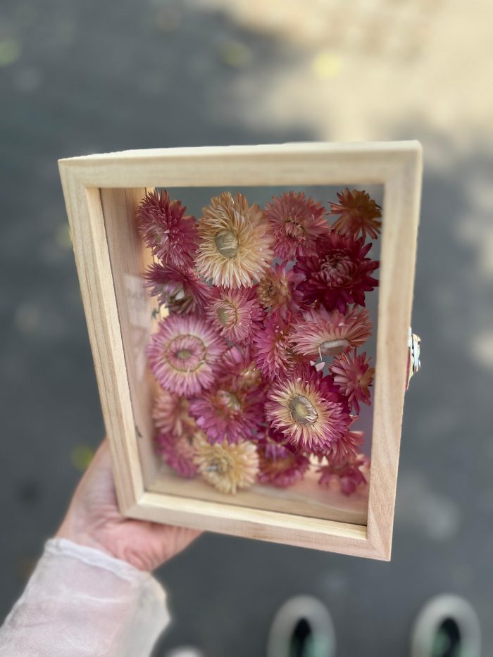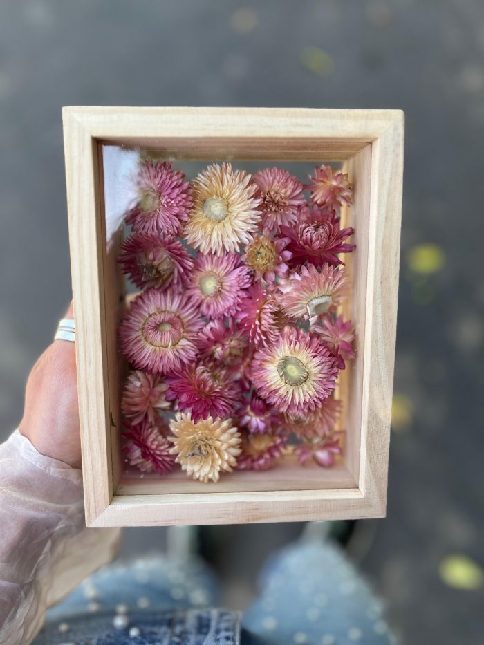 Incluye un marco de madera con Helicrisos Rosados secos entre vidrios. Ideal para decorar un dormitorio, baño o cocina.