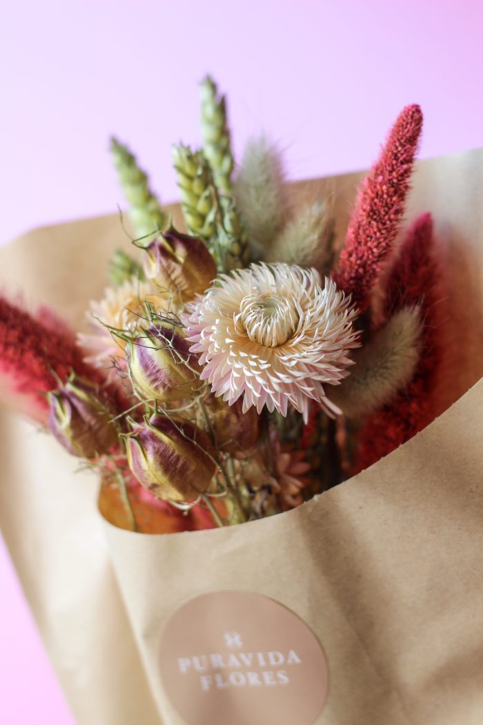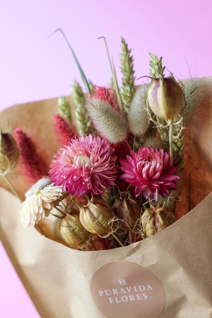 Este pequeño cucurucho de flores secas es ideal para aquellas personas románticas que le gusta el rosado y las texturas. Incluye un mix de flores secas holandesas en tonos rosados, fucsias y neutros. Largo aproximado de 30 cms.