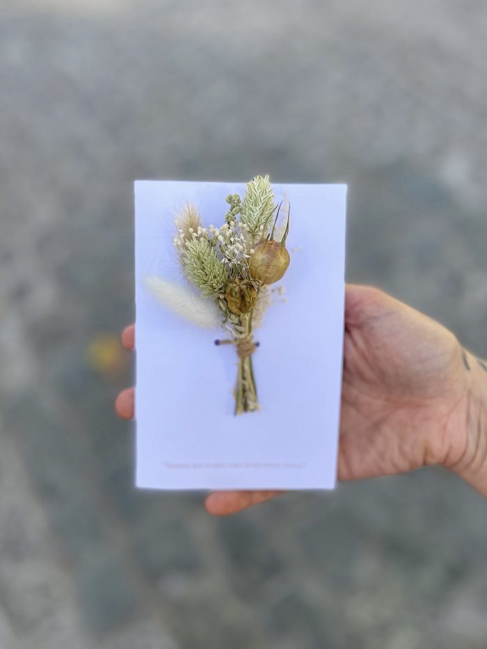 Cada ramito viene presentado en un tarjeta que sirve para regalar y sorprender a alguien con unas palabras (felices las escribimos por tí), también son ideales para vestir la mesa cuando tengas invitados (sobre cada puesto o junto a las servilletas), perfecto como botonera para un Novio, para pequeños rincones de tu casa, para decorar una vela y mil opciones más.
