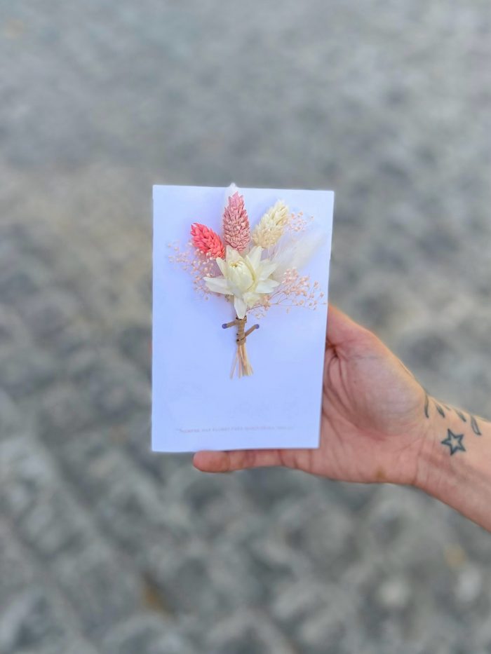 Incluye un mini ramito de flores secas holandesas 100% naturales en tono rosado. Cada uno es creado a mano, por lo que todos son diferentes entre sí, sorpréndete con el diseño del día.