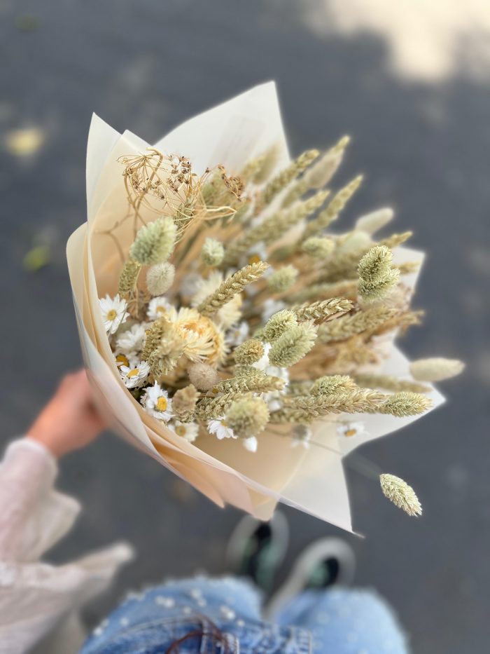 Este ramo es ideal para las personas que les gustan los colores neutros y el estilo silvestre. Incluye un mix de flores secas holandesas en tonos beige, cafe, verdes y blancos. Largo aproximado 35 cms.