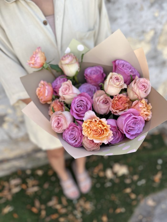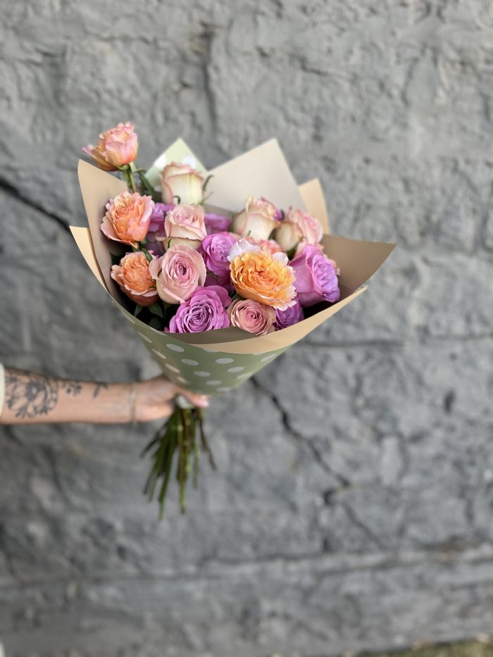 Ramo en espiral asimétrico que incluye un mix de 20 varas de rosas en tres tonos del día envuelto en papel del día.